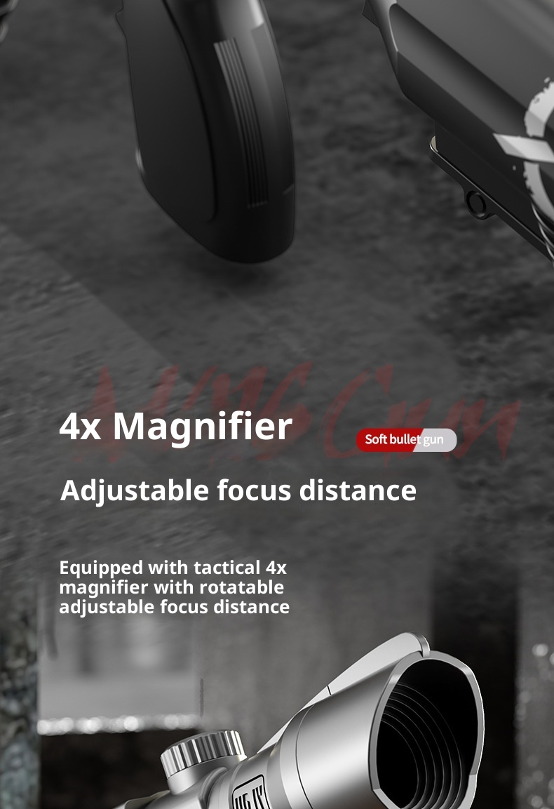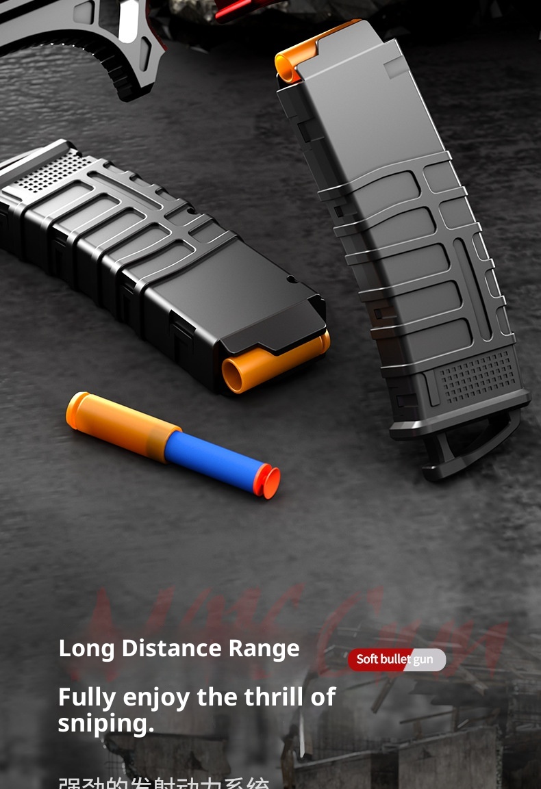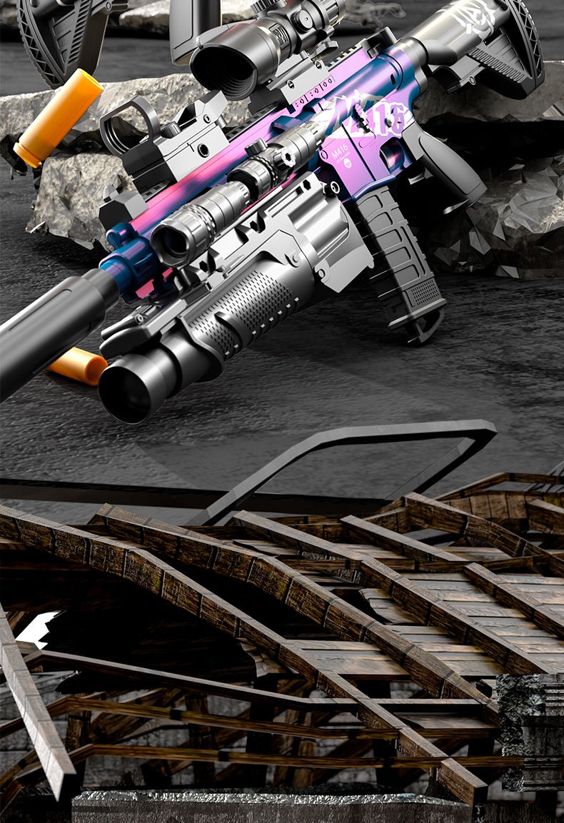 10 spent cartridge cases + 10 soft cartridges + 1 pendant + 1 sling + 1 angled grip + 1 gun body + 1 stock + 1 scope + 1 grip + 1 magazine + 1 suppressor